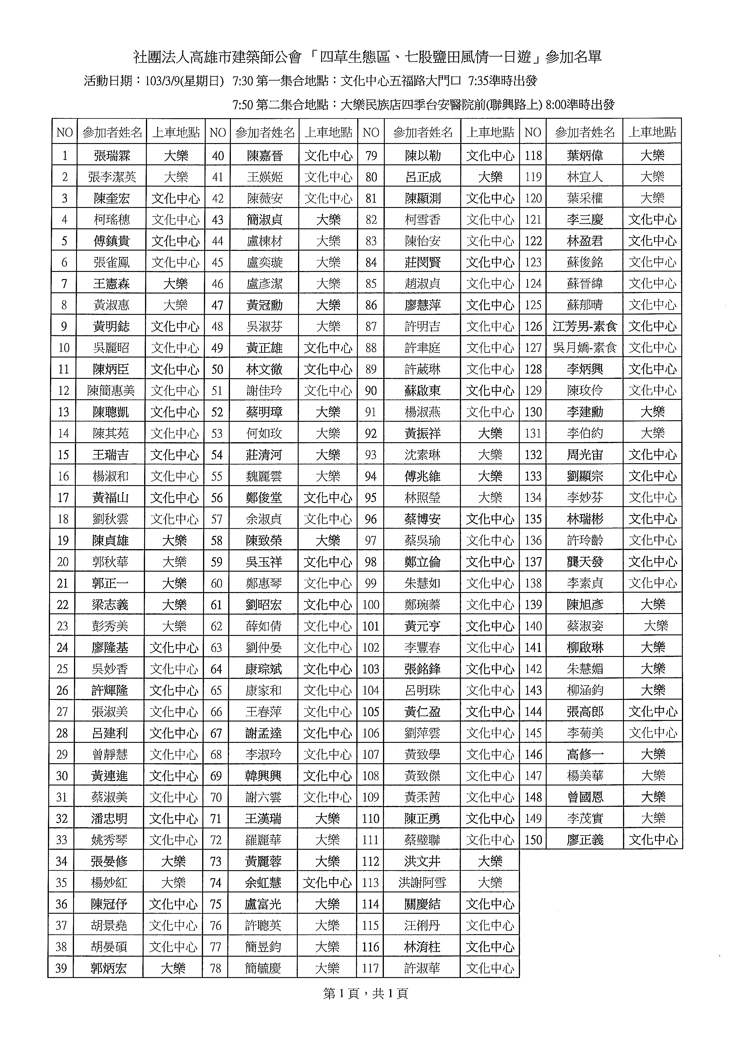 | 備註: | 1、報名時間:即日起至103年2月20日(四)下午5時正止。(額滿則提前截止,不再受理) 2、若因故無法參加時,至遲應於103年2月25日(二)前,以書面敘明原因向本會報備。 屆時未參加且又未報備者,本會恕不退還參加費用且需補繳保證金每人新台幣1,300元。 3、會員本人未報名參加時恕不受理眷屬報名。 4、本活動一律由高雄出發,並至指定地點集合上車。 5、有關參訪活動注意事項,俟報名確定後再行通知。 | ||